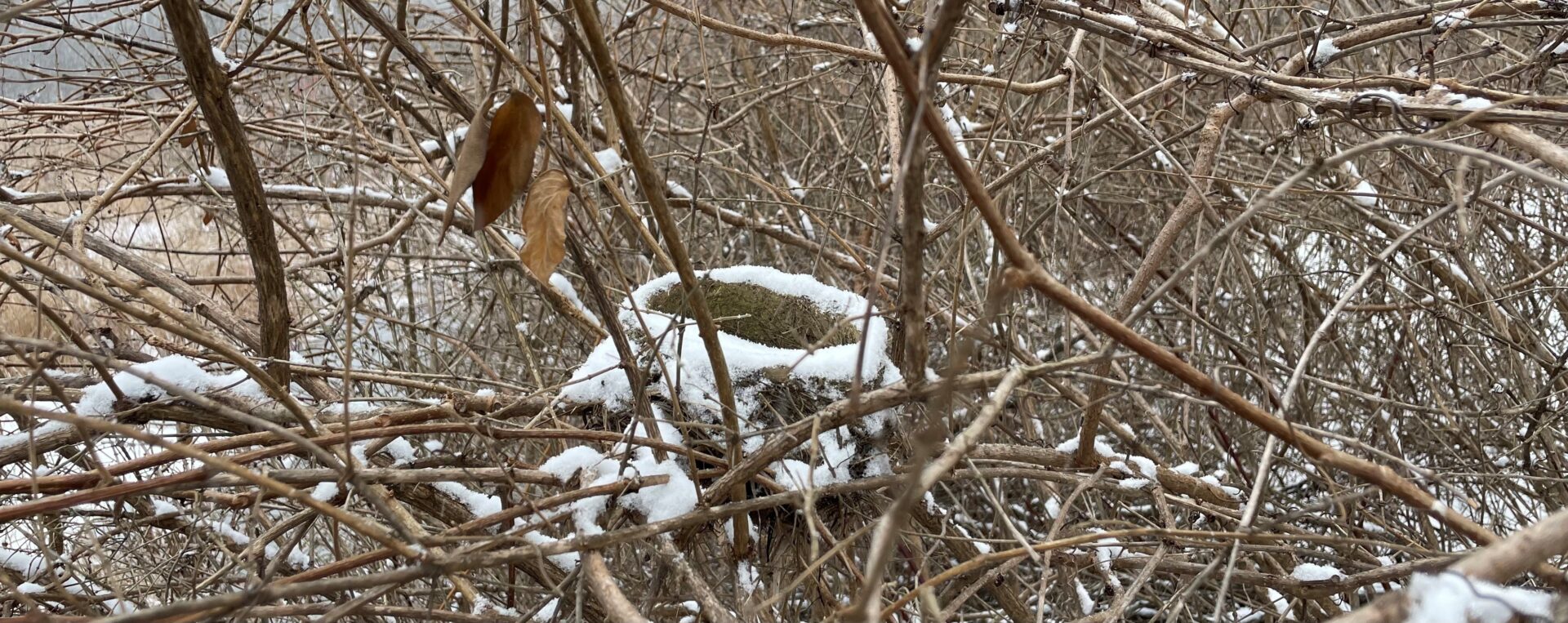 I took a walk in the snow yesterday and I was astounded at how many things I noticed that I had never seen before, even though I have passed them a hundred times. The biggest surprise was the bird nest that was hidden in a thicket of brush, made visible only because the snow highlighted its rim.